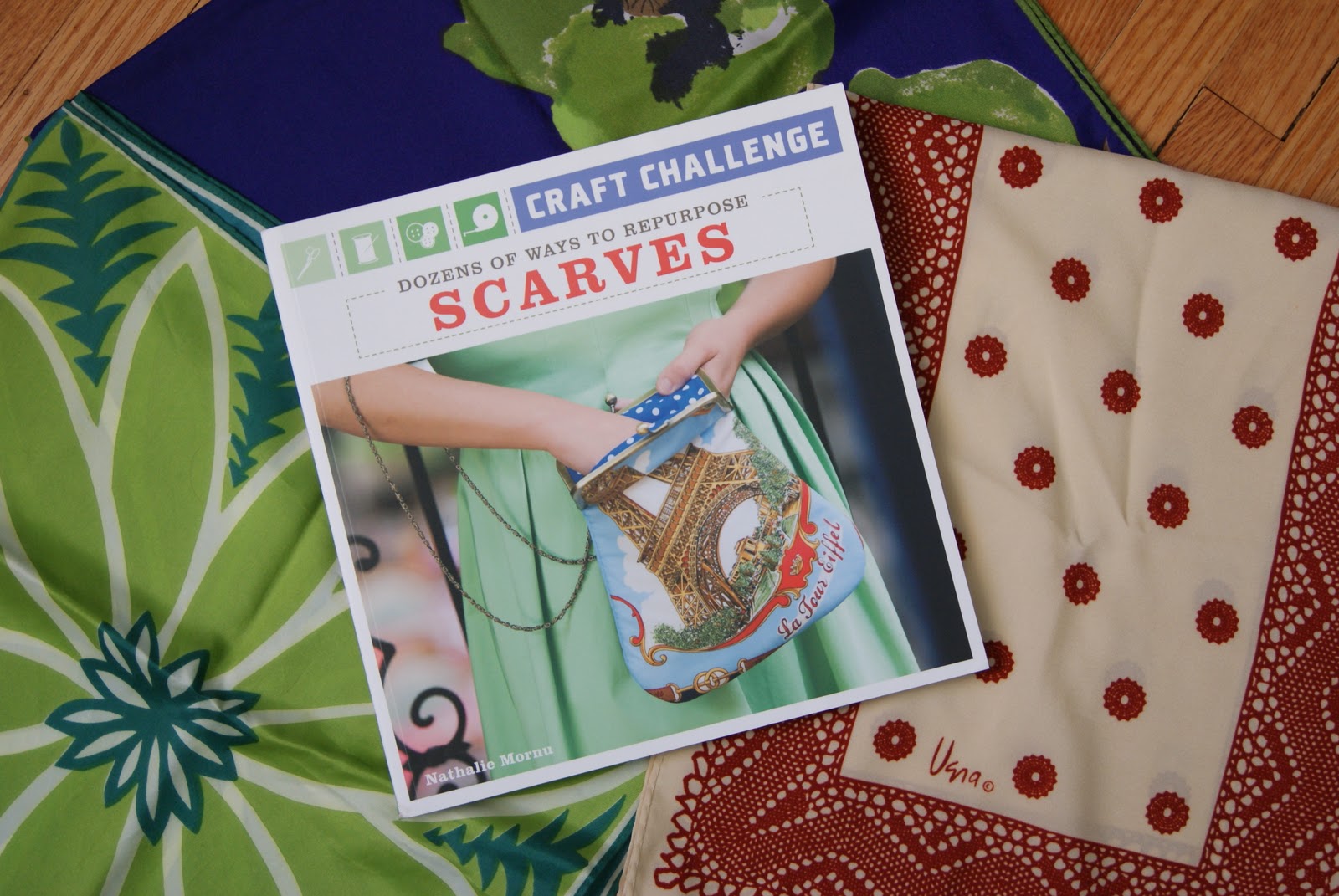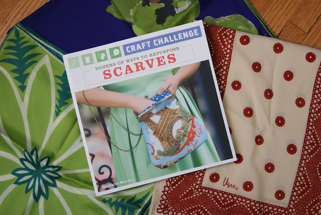One copy of the "Craft Challenge: Dozens of Ways to Repurpose Scarves" book (my project page signed by moi) & 3 vintage Vera scarves (use the 3 scarves to create one or more of the 30 sewing projects from the book)