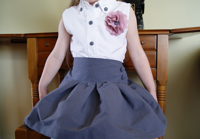 :: repurposed white dress (girls size 10) to a white shirt (girls size 4) with grey fabric covered buttons & a pink flower pin (it's removable)
