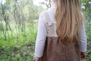 August's pattern for the Carefree Clothes for Girls sew-along was the dress with quilted bodice.  for the dress i sewed, i used linen (in all different shades of brown) from my fabric stash, vintage buttons & gold embroidery floss.  the changes i made to the pattern were:  i cut off the shoulder straps & added my own attaching them with vintages buttons, the quilting on the bodice was done with only vertical stitching, & the for the lining underneath i omitted the ruffle.  fun dress !