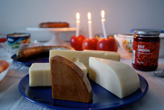2 cheeses from Norway: a type of Swiss cheese & Gjetost (brown cheese ! have you ever eaten brown cheese before?) & 2 cheeses from Denmark: Tilsit & Havarti creamy