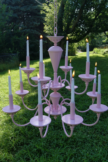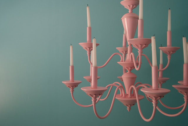 so I took this old ugly green faux-marbled and gold outdated chandelier, spray painted it with white primer, then spray painted it with pink paint. I told you it was easy !