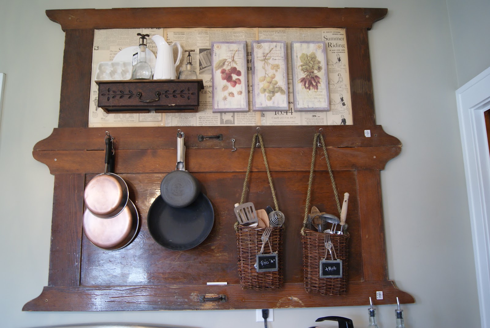 In the kitchen: newspaper as wallpaper & cupboard decor, swinging restroom doors used for wall decor & organization