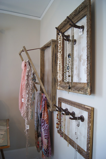 spools used as drawer pulls, storage bin labels made from floral candle rings & stenciled fabric