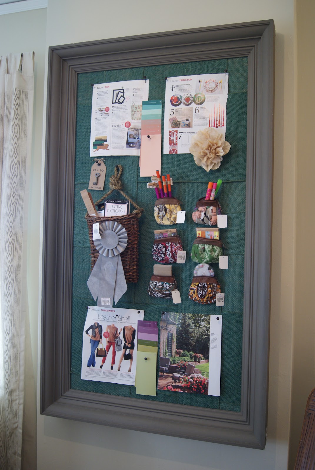 inspirational bulletin board made from an oversized frame & layered burlap, coin purses as wall-mounted storage pockets