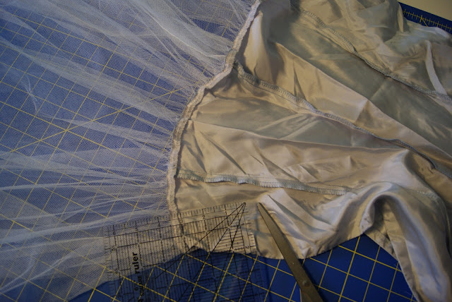 To make the crinoline to go under the Cinderella dress to make the skirt fuller, take the lining/crinoline part that was removed from the bridesmaid dress, cut the lining at 3 inches above the tulle.