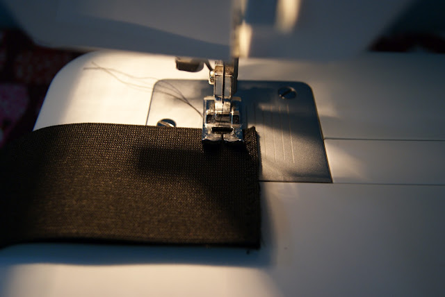 :: Take the black elastic, fold in half & sew 1/2" seam, open seam & sew down both sides of the seam
