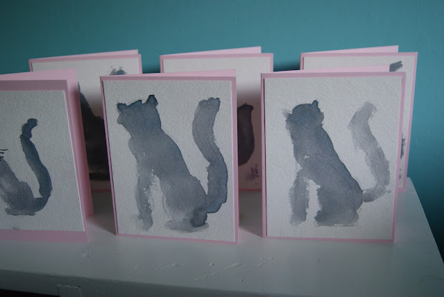 So we made our own invitations... I had my teenage son lightly sketch an outline of a cat in pencil on watercolor paper, then my daughter painted them in with watercolor paint.