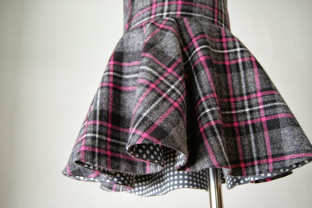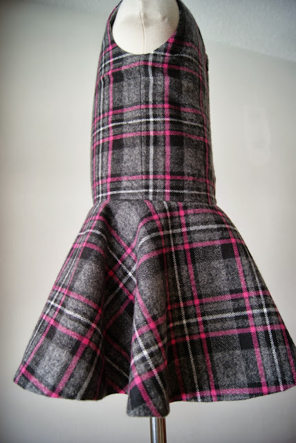The Plaid Dress is a sleeveless drop waist dress with a circle skirt. It has a v-neck back with an invisible zipper and a hook and eye closure. It is fully lined with bias binding on the skirt/bodice seam for a nice finishing touch.